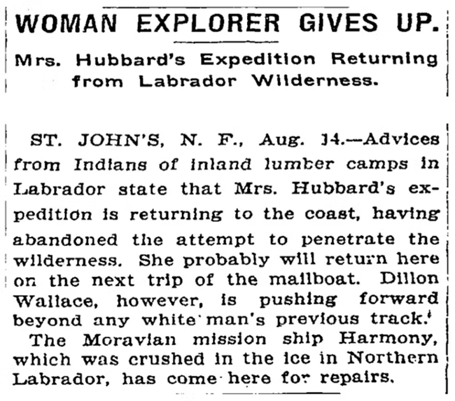 하지만 같은 신문은북부 래브라도를 탐험 중이던 남성 탐험가 딜런 월러스(Dillon Wallace)가 이전에 어느 백인도 가보지 못한 길을 개척하고 있다고 주장했다그러나 실제로 허버드는 포기한 적이 없었고월러스는 그를 따라잡지도 못했다오히려 그는 월러스 팀보다 몇 주 먼저 언개버 만에 도착했다하지만 황야는 여성의 영역이 아니다라는 당시의 지배적 서사에는탐험에 성공한 여성보다 실패한 여성이 더 어울렸다.