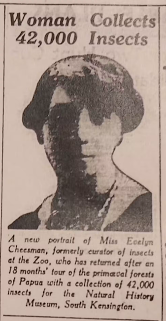 영국의 곤충학자 에벌린 치즈맨(Evelyn Cheesman)은 수십 년간 갈라파고스에서 뉴기니까지 태평양 섬들을 돌며 곤충을 수집했다그의 연구 덕분에 뉴헤브리디스 지역의 생태계를 구분하는 생물학적 경계선이 치즈맨 라인(Cheesman’s Line)’으로 명명되었다하지만 신문 보도는 그의 과학적 기여보다는 특이한 여성으로서의 면모에 초점을 맞췄다.