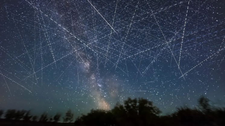 장시간 노출로 촬영한 사진에는 30분 동안 밤하늘의 한 구역을 지나가는 위성들의 수가 나타나 있다.  출처: Alan Dyer/VWPics/Universal Images Group via Getty Images