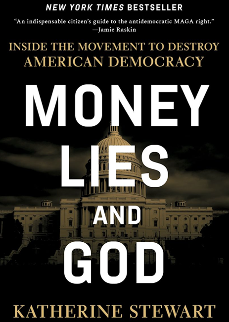 그 상처가 어디에서 왔으며, 수십 년에 걸쳐 어떻게 자라왔는지를 기자 캐서린 스튜어트(Katherine Stewart)의 신간 ⟪돈, 거짓말, 그리고 신: 미국 민주주의를 파괴하려는 운동 내부⟫(Money, Lies and God: Inside the Movement to Destroy American Democracy)가 다루고 있다.