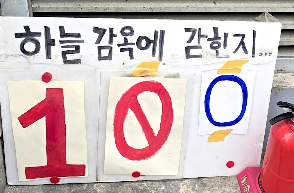 그 이후에도 함께 고공농성 중인 한국옵티칼하이테크지회 박정혜 동지, 거제통영고성 조선하청지회 김형수 동지와 서로 의지하면서 지내오다 보니 빠르게 100일이 흘러온 것 같다. 박정혜 동지는 500일이 넘도록 너무 오래 고공에 있고, 김형수 동지가 농성 중인 곳은 제가 있는 곳보다 훨씬 더 열악한 조건이어서 걱정이다.
