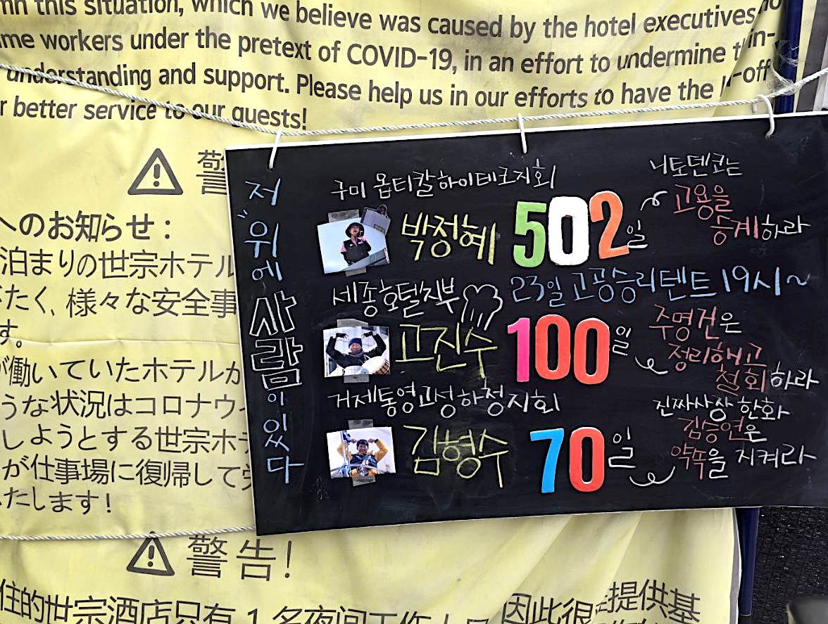 "박정혜 502일, 고진수 100일, 김형수 70일". 세종호텔 연대시민 김진아 제공