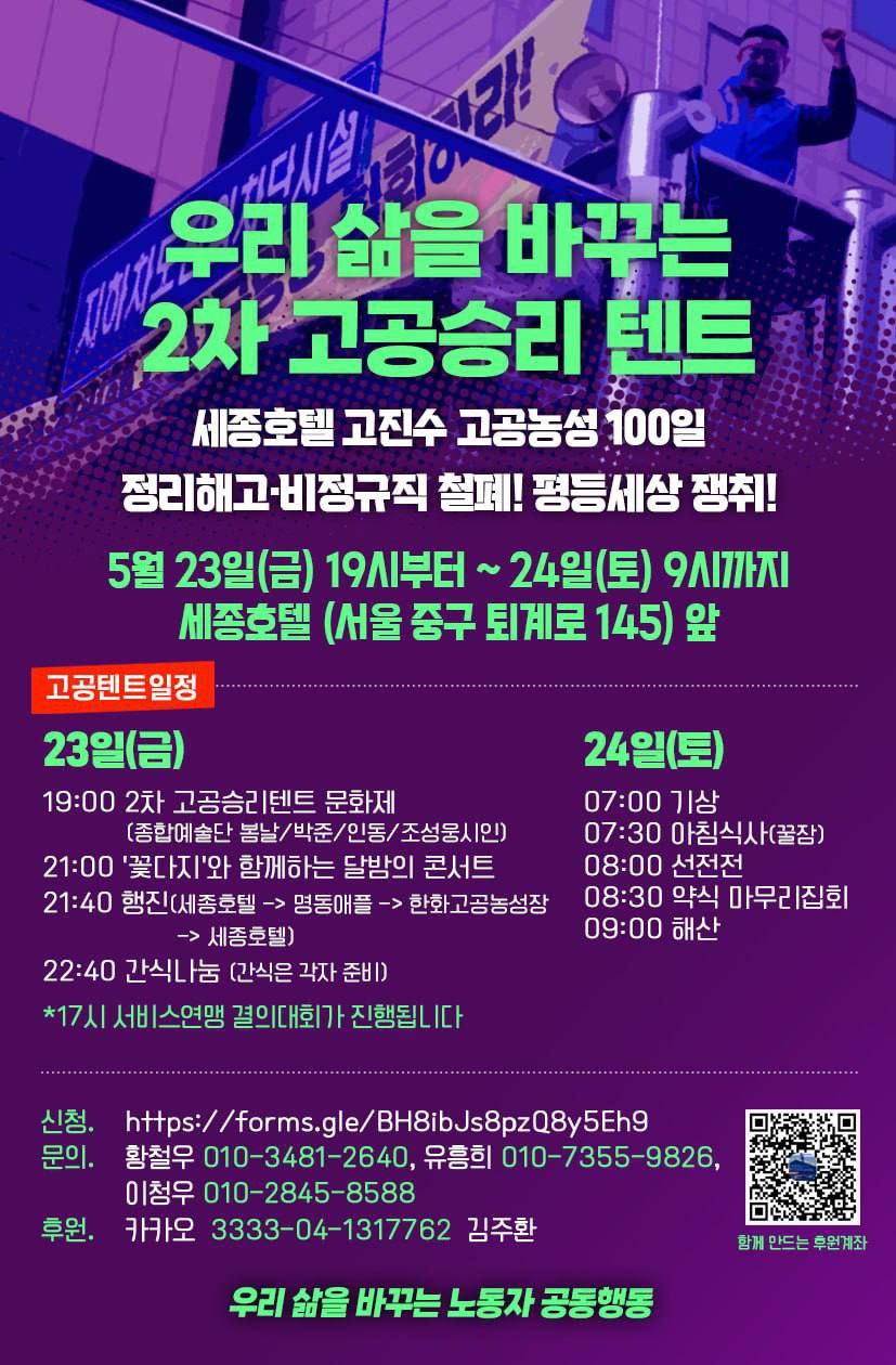 지난 2월 13일 새벽, "신발 속 거슬리는 모래알을 넘어 나와 일터를 지키는 위협적인 송곳이 되겠다"며 시작한 고진수 세종호텔 해고노동자의 고공농성이 5월 23일로 100일을 맞이했다.
