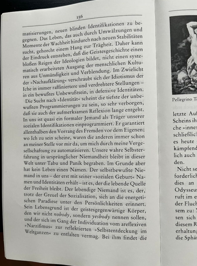 “새로운 불안정성을 마주하며 새로운 맹목적 동일시가 등장한다. 삶은, 뒤흔들림과 깨어나는 순간들을 거치면서도, 새로운 안정성을 추구하며 관성에 복종한다. 그 결과, 지적 역사는 단지 이데올로기의 회전목마일 뿐이라는 인상이 생겨난다—미성숙과 환상의 상태에서 인류 문명이 체계적으로 출현해온 것이 아니라는 것이다. ‘탈계몽’의 황혼 속에서, ‘나들(Iche)’의 어리석음은 점점 더 정교하고 뒤틀린 위치들 속으로 파고든다: 의식적인 무의식, 방어적 정체성 속으로 말이다.
