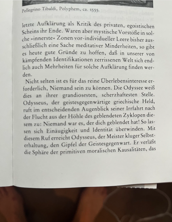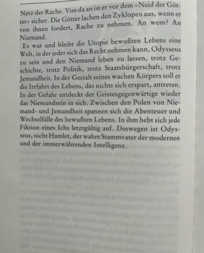 그것은 의식 있는 삶의 유토피아였고, 지금도 그렇다: 누구나 오디세우스가 될 권리를 주장하며 무명 존재가 살아가도록 허락받는 세계. 역사에도, 정치에도, 시민권에도, 누군가 됨에도 불구하고 말이다. 깨어 있는 몸의 형상 속에서, 그는 삶의 유랑 여정을 떠난다. 그 여정은 어떤 것도 피하지 않는다. 위기의 순간에, 정신적으로 깨어 있는 사람은 자신 안의 무명됨을 다시 발견한다. 무명성과 유명성이라는 두 극 사이에서 의식 있는 삶의 모험과 부침이 펼쳐진다. 이 의식 있는 삶 속에서, ‘나’라는 모든 허구는 결국 해체된다. 그래서 오디세우스야말로—햄릿이 아니라—현대적이며 끊임없이 재현되는 지성의 진정한 원형이다.”