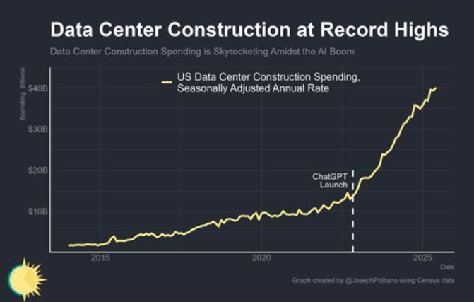 그리고 AI 투자 붐은 아직 끝나지 않았다미국의 데이터 센터 건설은 6월에 또다시 사상 최고치를 기록했고연이율 기준으로 처음으로 400억 달러를 넘어섰다이는 지난해 같은 시점보다 28% 증가한 수치이며약 3년 전 챗GPT(ChatGPT)가 출시된 이후로는 190%나 증가했다.