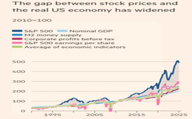 미국은 지금 사상 최고치를 경신한 주식 시장기술 대기업들의 AI 설비에 대한 무제한 투자이를 위한 대규모 차입이라는 상황 속에 있다하지만 아직 AI로부터 뚜렷한 수익이나 이익은 나타나지 않고 있다동시에다른 산업과 전반적인 경제는 둔화되고 있고상품 무역 적자는 확대되며실업률과 물가도 함께 오르고 있다이 모든 일이 2025년 하반기로 접어드는 시점에 벌어지고 있다.