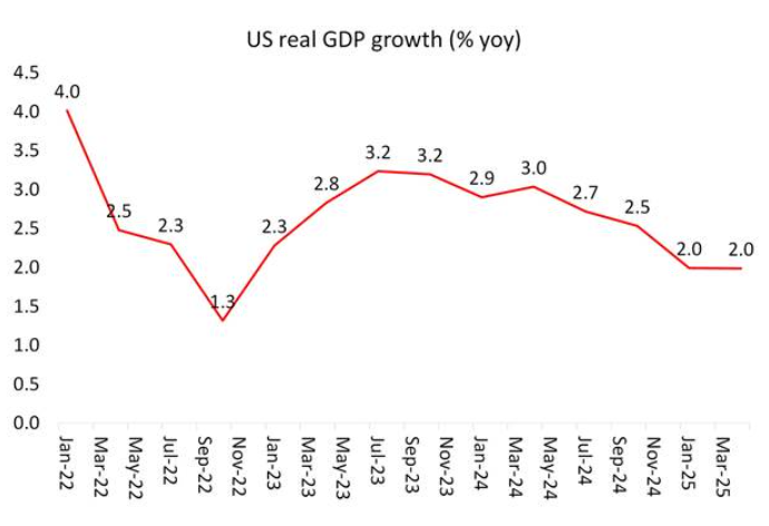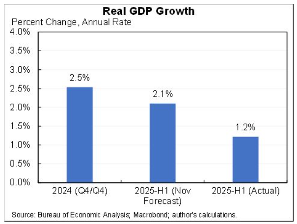 주류 경제학자 제이슨 퍼먼(Jason Furman)은 2025년 상반기 미국의 실질 GDP 성장률이 연이율 기준 평균 1.2%에 불과하다고 지적했다이는 2024년 성장 속도보다 훨씬 낮은 수준이며앞서 언급한 연 2% 성장률조차 앞으로 더 하락할 가능성이 높다.