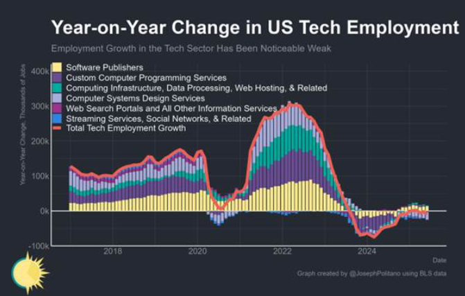 현재 미국 고용 시장은 팬데믹 침체 이후 최악의 상황에 처해 있다. 2025년 상반기에 해고된 인원은 거의 75만 명에 달하면서 해고 규모가 최고치를 기록했다심지어 고공 행진을 이어오던 기술 부문에서도 일자리가 줄어들었다모든 하위 부문을 통틀어 봐도 고용 증가율은 2022년 기술 산업의 정점이나심지어 코로나 이전 시대와 비교해도 한참 낮은 수준이다.