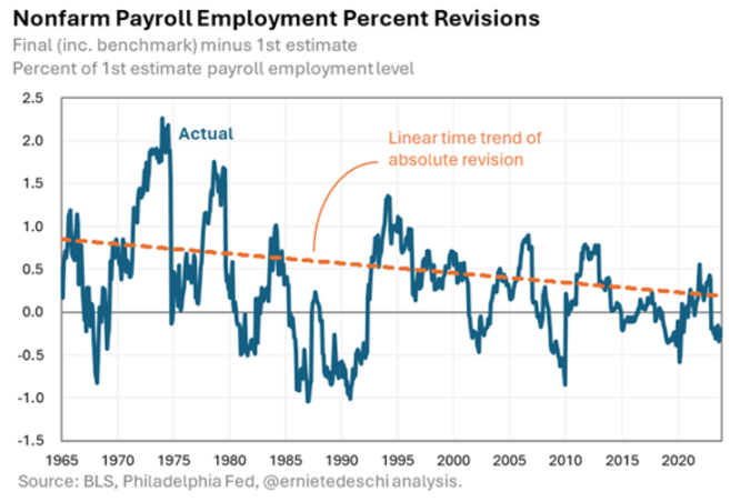 트럼프는 이 고용 지표 발표에 대해 보도한 측을 비난했다. 7월 고용 통계가 발표되자그는 미국 경제가 그 어느 때보다 강하다고 주장했고통계가 조작되었다며 노동통계국(Bureau of Labor Statistics)의 오랜 수장을 해임했다물론 고용 통계는 본질적으로 변동성이 크고노동통계국이 다양한 고용 증가 측정 기준을 일치시키는 데 어려움을 겪는 것은 사실이다하지만 트럼프의 조치가 아이러니한 이유는노동통계국의 급여 고용 추정치는 시간이 갈수록 정확도가 높아지고 있었기 때문이다.