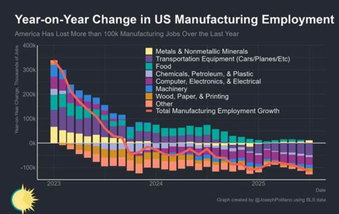 현실은 미국 경제가 한동안 둔화했고그에 따라 고용 증가세도 약화하고 있다는 점이다실제로 미국은 지난 1년간 제조업 일자리 11만 6천 개를 잃었고이는 초기 코로나 시기 이후 가장 빠른 속도의 일자리 감소이며, 2011년부터 2019년까지의 어떤 시기보다도 나쁜 수치다운송 산업에서 4만 9천 개전자 산업에서 3만 2천 개의 일자리가 줄어들면서 감소세를 주도했다.