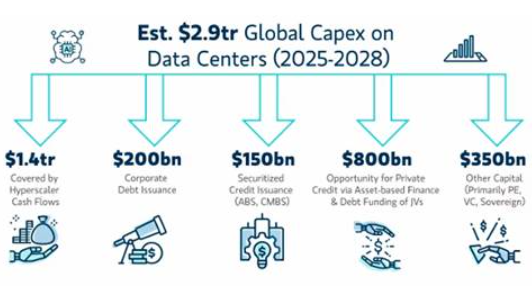 그 사이 AI 인프라 투자 붐은 더 가속화되고 있다매그니피센트 세븐이라 불리는 초대형 기술 기업들은 이 투자 비용을 현금 보유고를 줄이고 부채를 늘리는 방식으로 충당하고 있다. 2028년까지 약 3조 달러에 달할 것으로 예상되는 AI 데이터 센터 투자 가운데 절반은 기업의 현금흐름을 소진하는 방식으로나머지 거의 3분의 1은 프라이빗 크레딧(private credit)’이라고 불리는 비은행 대출 방식으로 조달되고 있다.