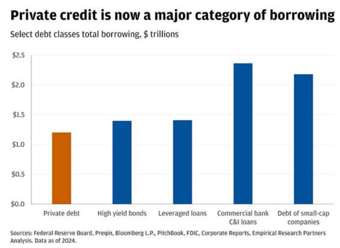 기술 기업들은 기존의 회사채 발행이나 은행 대출 같은 전통적인 방식보다는헤지펀드연기금기타 기관투자자들로부터 자금을 모아 대출해 주는 프라이빗 크레딧(private credit) 회사들을 통한 자금 조달을 선호하고 있다이들 신용 공급 구조는 채권 시장이나 은행처럼 규제받지 않기 때문에AI 거품에 문제가 생길 때 신용 시장에서 급격한 반응이 일어날 수 있다.
