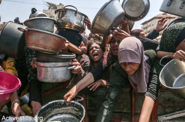 팔레스타인인들은 타는 듯한 햇볕 아래서이스라엘의 봉쇄로 인한 광범위한 기아 속에서 가자시티의 연대 부엌이 배급하는 음식을 받기 위해 기다리며 고통을 겪고 있다가자 보건부에 따르면 지난 24시간 동안 11명이 굶어 죽었다팔레스타인인들은 식량을 얻기 위해 GHF 배급소에서 목숨을 걸고 있으며이곳에서는 사람들이 일상적으로 공격당하고 살해되고 있다출처유세프 알-자눈/Activestills