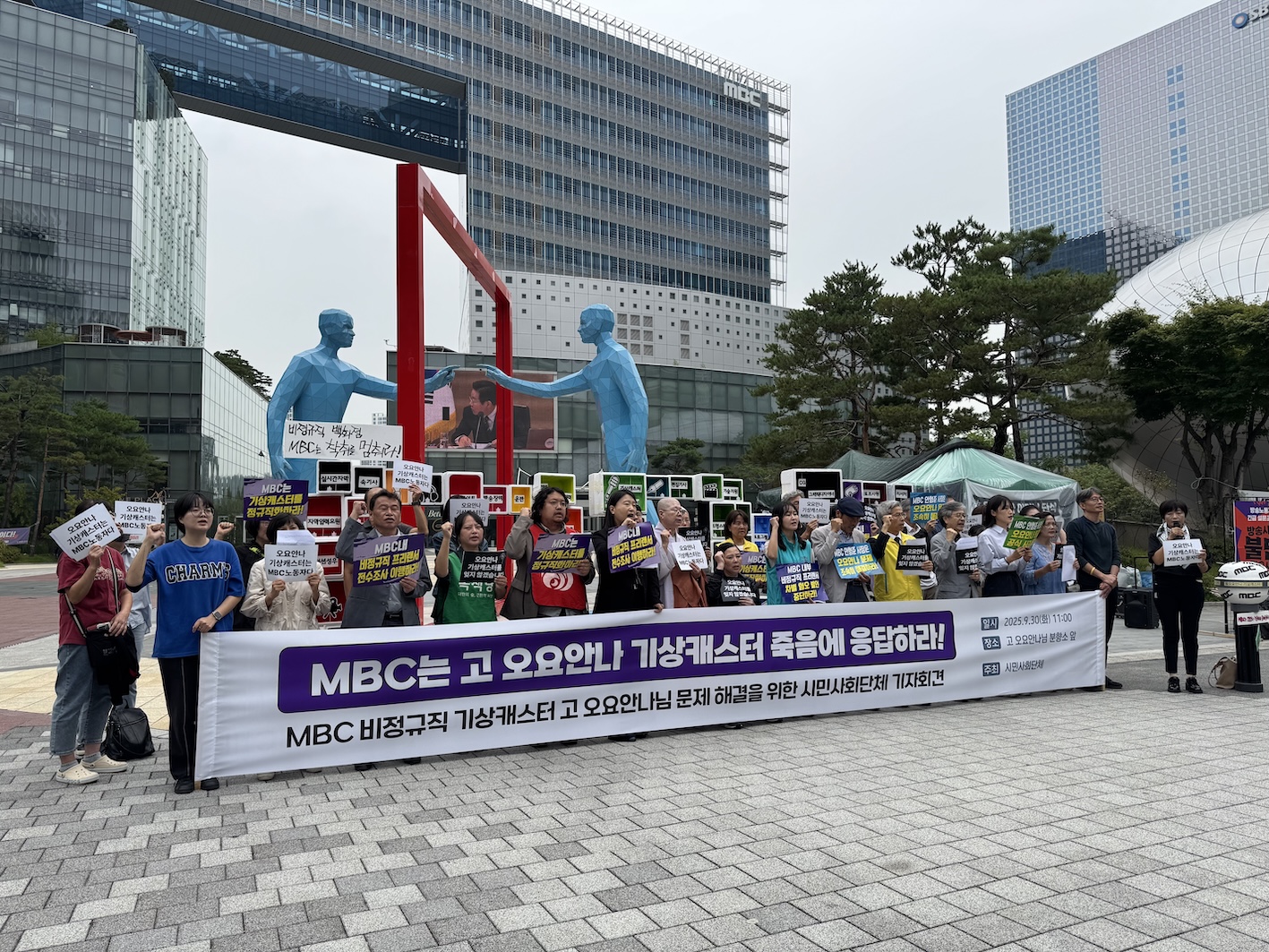 이날 기자회견을 공동주최한 84개 시민사회단체는 회견문을 통해 “유족은 제2의 오요안나가 발생해서는 안되기에 재발을 방지하기 위해서라도 기상캐스터의 정규직화를 요구했다”면서 “그런데 사측은 정규직화 방식에 대해 논의하고 협상하려 하기보다 아예 논의의 대상에서 제외하며, 죽음의 원인마저 가리려 한다”고 규탄했다. 이들은 “벌써 유족의 단식이 23일째”라며 “20일이 넘어가면 근육과 내장 장기 등이 약해진다”, “명절 전에 해결하려 노력해야 할 책임이 있는 MBC가 고인의 어머니까지 죽음으로 몰아가려는 것인가” 지적하고, “늦었지만 이제라고 MBC는 결자해지의 자세로 고 오요안나의 죽음에 대해 공식으로 사죄하고 고인의 명예 회복과 재발방지책을 마련하는 데 나서라”라고 요구했다.