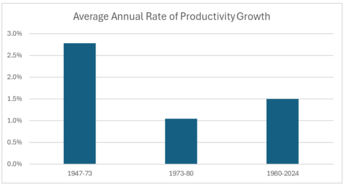 과거 이해관계자 자본주의 시기의 평균 연간 생산성 증가율은 지금보다 1.3%P 높았다. 과거에는 감가상각이 산출량에서 차지하는 비중이 더 낮았다는 등의 기술적인 이유까지 고려하면, 이 격차는 실제보다 훨씬 더 클 수 있다. 나는 1970년대의 침체기를 별도의 시기로 분류했는데, 이 시기를 어디에 포함해야 할지는 논란의 여지가 있다. 이 시기는 미국 경제가 오늘날보다 석유에 훨씬 더 의존하고 있었던 시절에, 두 차례의 대규모 유가 상승이 경제를 심각하게 흔든 시기였다. 어쨌든 이 시기를 앞선 시기에 포함한다고 해도 전체적인 그림이 달라지지는 않는다.