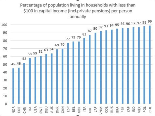 자본 소유의 확산. 자본은 매우 집중되어 있다. 아래 그림은 평균적으로 선진국과 중소득 국가의 가구 중 77%가 자본으로부터 받는 현금소득이 0이거나 0에 가깝다는 것을 보여준다. (“0에 가깝다”는 1인당 연간 100달러로 정의한다.) 여기서 자본은 소유주에게 현금소득을 만들어주는 금융자본 또는 생산자본만 포함한다는 점에 유의해야 한다. 이는 자가 사용 주택, 보석, 그림, 가구 등도 포함하는 가계 자산과는 동일하지 않다. 자본소득이 가장 널리 퍼져 있는, 즉 “자본소득이 0인 가구”의 비중이 가장 낮은 국가는 노르웨이, 한국, 그리고 (흥미롭게도) 중국이다. 그러나 그곳에서도 약 절반의 가구가 자본으로부터 아무런 소득을 받지 않는다. 미국에서는 그 비율이 거의 60퍼센트이며, 다른 선진국에서는 70퍼센트를 초과한다. (이 주제에 대해서는 이전의 내 글에서 더 자세히 논의했다.)