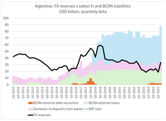 IMF가 그 이후 막대한 대출을 제공했음에도 아르헨티나의 외환보유액은 현재 2018년보다 더 낮다당시 마우리시오 마크리(Mauricio Macri) 전 대통령은 500억 달러를 빌렸는데이는 IMF 역사상 최대 규모의 구제금융이었다그러나 그의 정치적 몰락으로 IMF 프로그램이 궤도에서 벗어나고 통화가 타격을 입었다이제 IMF의 대출과 중국과의 통화스와프 같은 부채를 감안하더라도올해 아르헨티나의 외환보유액은 여전히 크게 마이너스 상태를 유지하고 있다이는 IMF가 새로운 200억 달러 구제금융의 절반 이상을 선지급했음에도 그렇다.