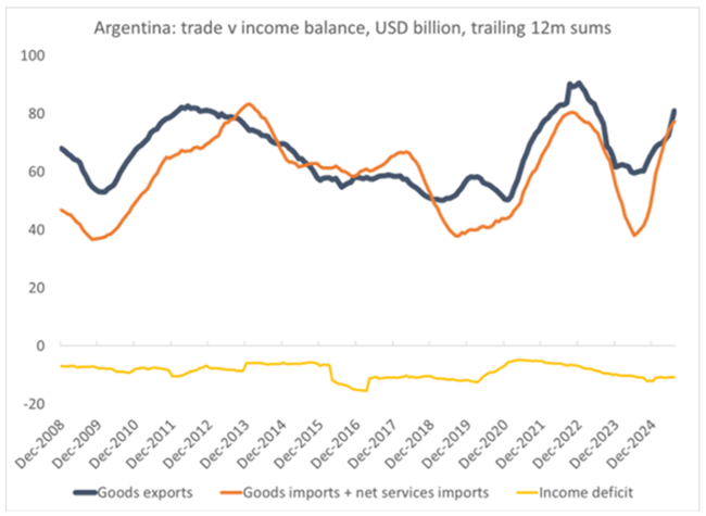 밀레이가 정부 예산의 균형을 만들었을지 몰라도그의 재정 전기톱(fiscal chainsaw)’은 무역수지의 지속적인 취약성을 해결하지 못했다밀레이 집권 이후 수출이 약간 늘었지만 수입도 함께 증가했고수출로 벌어들인 소득은 해외로 빠져나갔다그 결과 경상수지의 월간 소득 적자가 확대됐다.