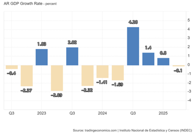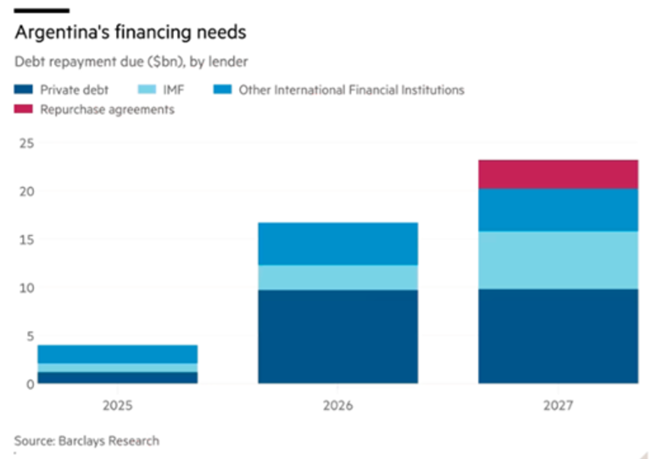 2026년 9월부터 민간 채권자들에게 상환해야 할 대규모 외화 부채 서비스 의무가 도래한다바클레이스(Barclays)에 따르면아르헨티나는 60억 달러의 순보유액에 불과한 반면, 950억 달러 규모의 달러 및 유로 표시 부채를 보유하고 있다그리고 이제부터 2027년 하비에르 밀레이(Javier Milei) 임기 종료까지 440억 달러에 달하는 부채를 상환해야 한다따라서 밀레이는 귀중한 외환보유액을 페소 방어에 사용할 여력이 거의 없다.