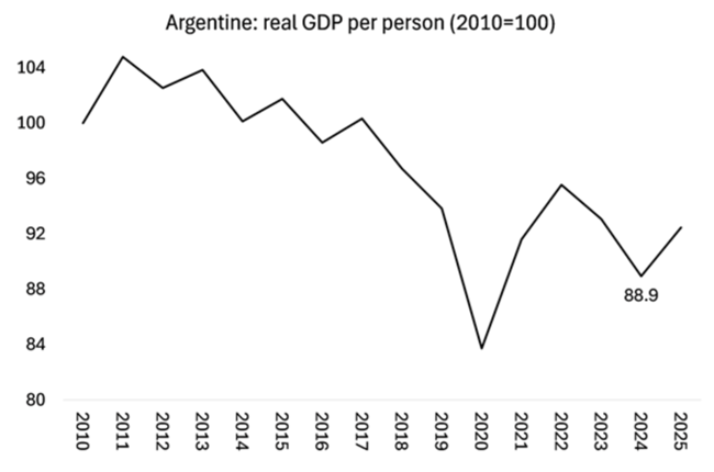 이것이 바로 아르헨티나 자본주의의 장기적 서사다경제는 사실상 2008~2009년 세계 대침체 이후특히 2012년 글로벌 원자재 가격 호황이 끝난 이후로 정체돼왔다. 2012년부터 2024년까지 13년 동안 실질 GDP의 평균 성장률은 고작 0.1%에 불과했다산업 생산은 감소하고 가계 소비는 정체돼 있으며소매 판매는 하락하고 있다이는 놀라운 일이 아니다공무원 임금이 실질 기준으로 33.8%나 하락했고아르헨티나 국민들이 생계를 위해 필사적으로 비공식 일자리를 찾아 나서고 있기 때문이다.