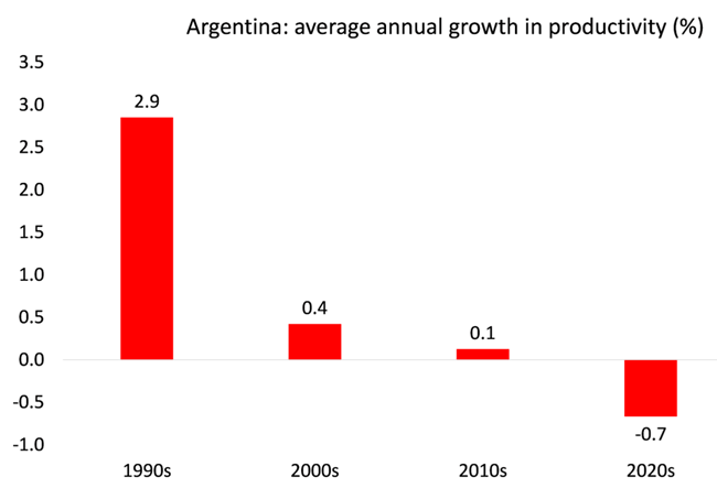 아르헨티나 마르크스주의 경제학자 롤란도 아스타리타(Rolando Astarita)가 지적했듯이아르헨티나의 근본적 약점은 기술적·생산적 후진성에 있다. 바카 무에르타(Vaca Muerta) 지역의 에너지나 대두·옥수수 산업처럼 아르헨티나가 천연 자원에서 비교우위를 가진 일부 부문을 제외하면생산성 수준은 국제 기준에 비해 매우 낮다심지어 대두옥수수 부문에서도 생산성은 미국 생산자보다 낮다이러한 차이는 본질적으로 투입재와 기술 수준에 대한 투자 격차에서 비롯된다.