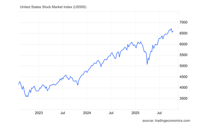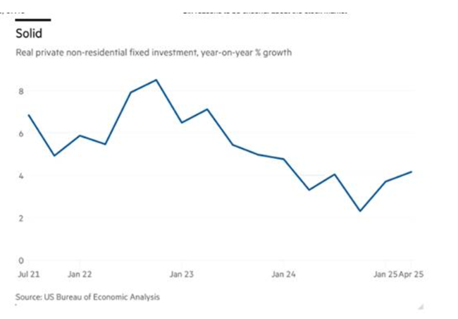 은행보험사연기금헤지펀드 등 금융자산 투자자들은 금융시장에 대해 극도로 낙관적이고 자신감에 차 있다록펠러 인터내셔널 의장 루치르 샤르마(Ruchir Sharma)는 이렇게 말했다. “높은 관세이민 감소제도 붕괴부채 증가끈질긴 인플레이션 등 미국 경제에 가중되는 위협에도 대기업과 투자자들은 전혀 동요하지 않는다그들은 인공지능이 워낙 거대한 힘이어서 모든 도전을 상쇄할 수 있다고 점점 더 확신하고 있다.” 2025년 들어 현재까지 미국 주식시장의 상승분 중 80%는 인공지능(AI) 기업이 차지하고 있다이는 AI 주도 주식시장이 전 세계에서 자금을 빨아들이며 미국의 성장을 촉진하는 데 기여하고 있다. 2025년 2분기에 외국인들은 미국 주식에 사상 최대 규모인 2,900억 달러를 쏟아부었으며현재 미국 주식시장의 약 30%를 보유하고 있다이는 제2차 세계대전 이후 가장 높은 비중이다샤르마의 표현대로미국은 이제 거대한 AI에 대한 한 가지 베팅이 된 셈이다.