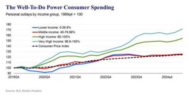 현재 미국에서 큰돈을 쓰는 사람들은 상위 20% 소득층뿐이다이들 가계는 그나마 좋은 성과를 내고 있으며특히 상위 3.3%의 초고소득층은 훨씬 더 많은 이익을 누리고 있다반면 나머지 대다수는 허리띠를 졸라매며 소비를 줄이고 있다.