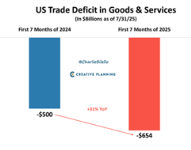 게다가 관세가 결국 미국의 무역적자를 개선할 것이라는 주장도 터무니없다는 사실이 드러났다. 2024년 첫 7개월 동안 미국의 무역적자는 5,000억 달러였지만, 2025년 같은 기간에는 6,540억 달러로 전년 대비 31% 증가해 사상 최대치를 기록했다.