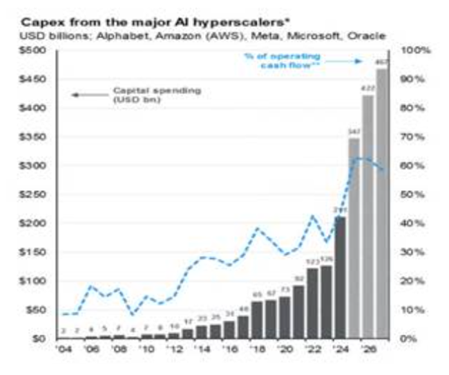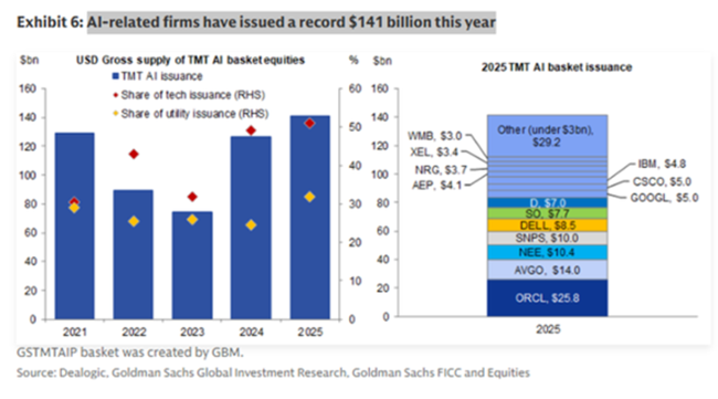 물론 대형 기술기업들은 지금까지 대부분의 AI 투자를 잉여현금흐름으로 충당해왔다그러나 매그니피센트 세븐의 막대한 현금 보유액도 점점 소진되고 있으며, AI 기업들은 점차 주식과 부채 발행을 통해 자금을 조달하는 방향으로 전환하고 있다.