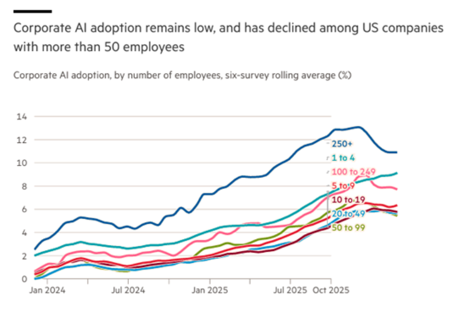따라서 AI 기술이 결국에는 인간 노동을 충분히 대체할 만큼 효율화된다면더 높은 생산성 성장을 실현할 가능성은 있다그러나 이는 금융 붕괴와 그에 따른 미국 경기 침체 이후에나 나타날 가능성이 크다그리고 AI 주도형 미국 경제가 침체에 빠지면주요국 경제들 역시 함께 추락할 것이다시간은 매그니피센트 세븐의 편이 아니다실제로 기업들의 AI 기술 도입률은 여전히 낮으며대기업들 사이에서도 오히려 감소하고 있다.