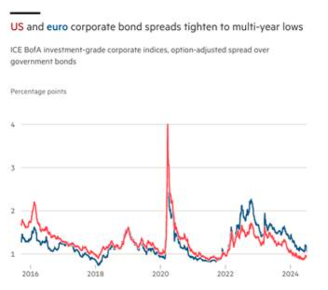 호황을 누리는 것은 기업 주식만이 아니다특히 이른바 매그니피센트 세븐(Magnificent Seven)’으로 불리는 대형 기술 및 인공지능(AI) 기업들의 부채를 보유하려는 수요가 폭발적으로 늘고 있다. ‘안전한’ 국채와 비교했을 때 기업채가 지급하는 금리 차이(이자 스프레드)는 1%포인트 이하로 떨어졌다.