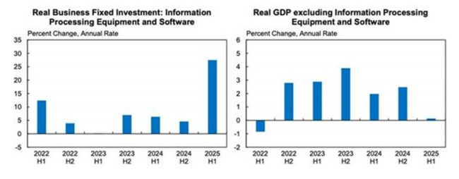 2022년 이후 AI 인프라 투자는 4,000억 달러 증가했다이 중 상당 부분은 정보처리 장비에 집중되었으며해당 부문 지출은 2025년 상반기에 연율 39%라는 폭발적인 증가세를 기록했다하버드대 경제학자 제이슨 퍼먼(Jason Furman)은 정보처리 장비와 소프트웨어에 대한 투자가 미국 GDP의 4%에 불과하지만, 2025년 상반기 GDP 성장의 92%를 차지했다고 지적했다만약 이 부문을 제외하면미국 경제는 같은 기간 연율 0.1% 성장에 그쳤다.