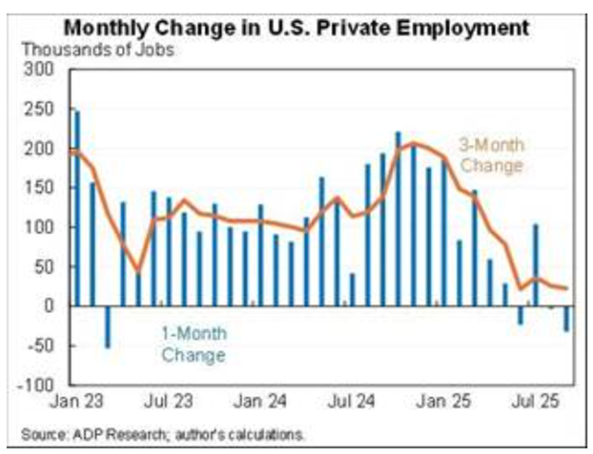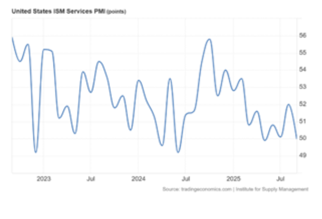 이제 더 큰 비중을 차지하는 서비스 부문에서도 문제의 조짐이 나타나고 있다경제 동향을 보여주는 지표인 ISM 서비스 구매관리자지수(PMI)는 2025년 8월 52에서 9월 50으로 하락했으며예상치 51.7을 크게 밑돌았다이는 서비스 부문이 사실상 멈춰 섰음을 의미한다.