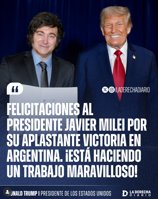 “아르헨티나에서 압도적인 승리를 거둔 하비에르 밀레이 대통령에게 축하를 전한다. 그는 훌륭한 일을 해내고 있다!” — 도널드 트럼프. 출처: 하비에르 밀레이 대통령 페이스북