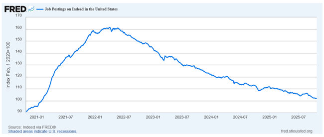 하지만 나는 그 반대편, 즉 채용 감소 쪽을 더 우려하고 있다. 그 근거로 나는 인디드(Indeed)의 채용지수를 든다. 가이 역시 이 지수를 언급하지만, 그는 우리가 지난 3년 반 동안 이어져 온 완만한 하락 추세 위에 여전히 놓여 있을 뿐이라고 본다. 그러나 내가 보기에는 이 하락세가 단순한 완만한 추세선이라기보다는, 노동시장이 점점 더 냉각되고 있다는 신호처럼 보인다.