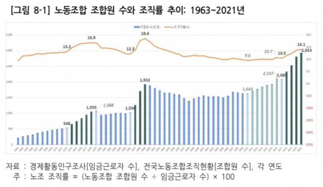 그도 그럴 것이 한국 노동조합운동의 역사 가운데서 ‘제3의 물결’이라 불리울 만큼 광범한 노동조합 설립의 확산이 이루어지는 시기가 최근에 있었기 때문이다. 제1의 물결은 1973~1978년으로 50만 7천 명이 조직된 시기(증가율 14.0%), 제2의 물결은 1986~1989으로 89만 6천 명이 조직된 시기(증가율 23.1%), 그리고 지금인 제3의 물결은 2017~2021년으로 조합원 수가 84만 4천 명이 조직된 시기(증가율 8.9%)이다. (다만 이 노조 조직화의 ‘제3의 물결’이 멈췄는지, 지속되고 있는지는 후속 연구를 기다려봐야 하겠다. 표면적으로는 2022~2023년에는 조직률이 감소한 것으로 나타나기는 한다.) 이 제3의 물결 시기에 비정규직과 청년, 여성 노동자들의 조직이 크게 늘어났다.