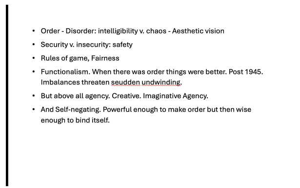 세계 질서보다 세계 재편(world ordering)에 집중할 필요가 있다모두에게 똑같이 적용되는 하나의 세계를 전제로 하기보다는다양한 관점에서 세계를 바라보아야 한다규칙과 헌법에 기대어 확실성과 장기적 계획 가능성을 확보하려 하기보다공동의 계획프로그램정치적 약속실천의 규모명확한 비전을 중심으로 사고하는 것이 낫다우리는 규범을 걱정하기보다는구체적인 성과를 만드는 데 더 집중해야 한다.
