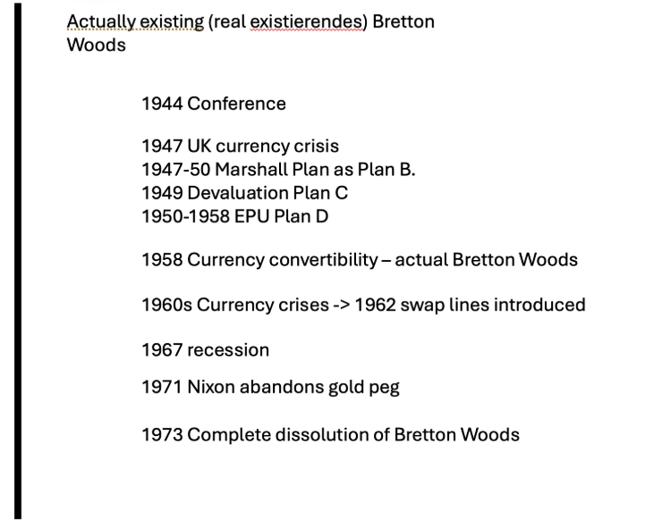 1944년 회의 이후, 1947년 영국의 통화 위기가 발생하면서 브레턴우즈 체제의 실행은 연기되었다이에 따라 마셜 플랜(Marshall Plan)이 등장했는데사실상 브레턴우즈를 실행하지 않기 위한 플랜 B였다이어서 경쟁력을 높이기 위해 파운드 스털링과 다른 모든 유럽 통화가 평가절하되었고이는 각국 경제에 큰 충격을 주었다이후 1950년부터 1958년까지 유럽지급동맹(European Payments Union)이 설립되었다.