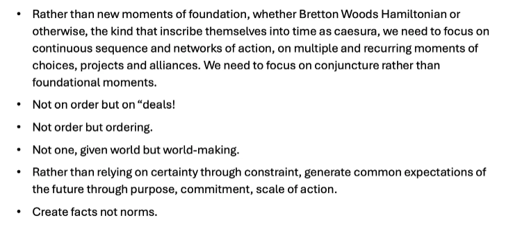 브레턴우즈나 해밀턴 체제 같은 역사적 결정적 순간들즉 역사 속의 마침표로 새겨지는 새로운 토대의순간을 찾기보다는우리는 지속적인 연속행동의 네트워크반복적으로 찾아오는 선택의 순간에 집중해야 한다. 토대적 순간보다는 국면(conjuncture)에 주목해야 한다헌법이나 질서보다, ‘거래를 고려할 필요가 있다트럼프 집권 시기 이후 거래라는 용어가 오염되긴 했지만양측 모두 자기 이해를 확인할 수 있는 좋은 거래는 최악의 결과는 아닐 수 있다.