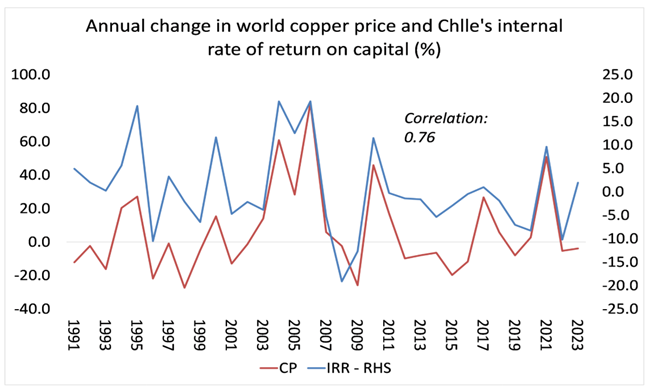 세계 구리 가격 연간 변화율과 칠레의 내부자본수익률(%) 출처: Penn World Tables 11.0