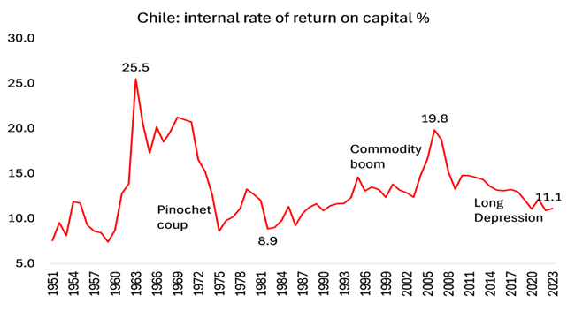 칠레의 상대적 경제 성과는 항상 구리와 광물 수출에 기반해왔다. 칠레는 30년 넘게 세계 최대 구리 생산국이었고, 국가 전체 수출의 약 50%가 구리 관련 제품에서 나온다. 광업 부문은 칠레 GDP의 15%를 차지하며 20만 개의 일자리를 창출한다. 구리와 광물 가격이 높고 상승할 때 칠레 경제는 더 좋은 성과를 내고, 그 반대일 때는 악화한다. 아래 그래프가 보여주듯이 칠레 자본의 수익성은 구리 가격 순환에 의해 움직여왔다.