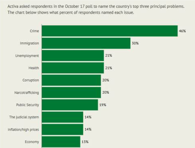 Activa는 10월 17일 실시한 여론조사에서 응답자들에게 나라의 가장 중요한 세 가지 문제를 꼽도록 요청했다. 아래 차트는 각 문제를 지목한 응답자 비율을 보여준다. 범죄 46%, 이민 30%, 실업 21%, 보건 21%, 부패 20%, 마약 밀매 20%, 공공 안전 19%, 사법 제도 14%, 인플레이션/고물가 14%, 경제 13%