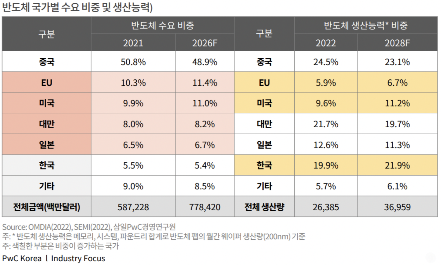 이 속에서 한국의 반도체 산업 전략은 지속적인 생산능력 증대에 있어 과잉생산을 부추길 뿐만 아니라 반도체 시장의 근본적 불안의 원인을 제공하고 있다. 삼성전자는 6년 연속 세계 1위의 설비투자액을 기록했고, SK하이닉스도 글로벌 4~5위권이다. 여기에 반도체 메가클러스터, 용인반도체 국가산단 설치 등 주로 설비와 생산능력 증대에 꽂혀 있다. 미국 등 해외 공장 증설까지 포함한다면, 반도체 생산능력과 시장 점유율은 세계 최고 수준에 달한다.