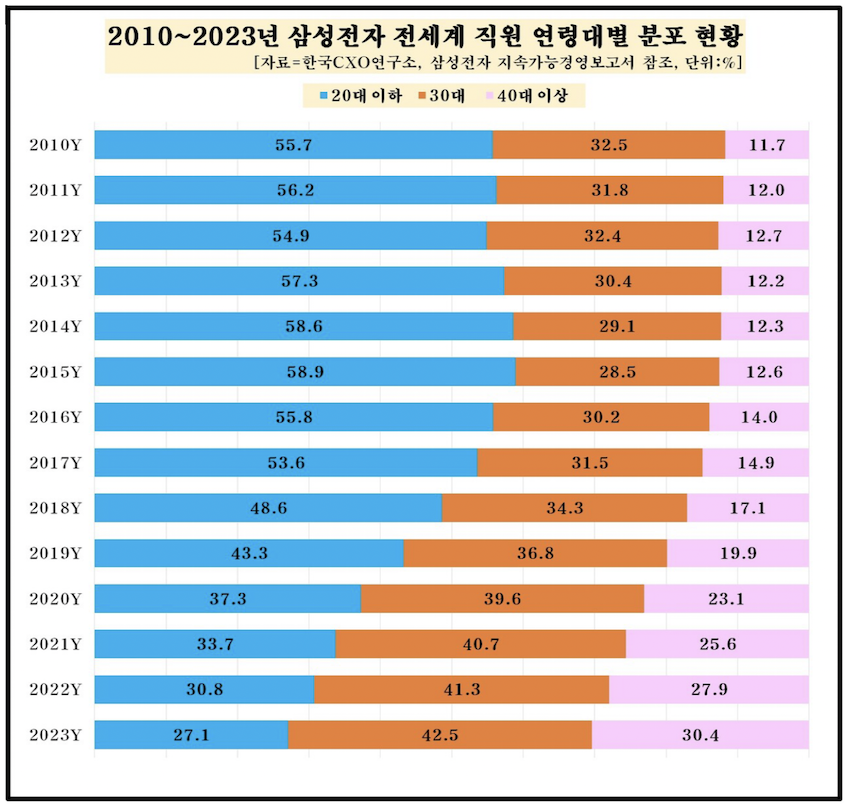 또한, AI·로봇 등 자동화로 고용유발계수는 지속적으로 하락해, 투자가 늘어도 고용은 오히려 줄고 있다. 실제로 2010년대 라인당 15명 이상 필요했던 생산직 인력은 스마트공장 도입 후 1.5명 수준까지 줄었다. 2017년 평택공장이 가동을 시작하고, 2020년 당시 세계 최대 규모의 평택 2라인이 가동되었어도 2010년 이후 삼성전자의 국내 고용 인원은 큰 변동이 없었다. 삼성전자의 전체 임직원 수는 2015년 32만 명이 넘었지만 2019년 30만 명에서 2022년 26만6천 명으로 감소했고, 생산직 비중도 계속 줄고 있다. 특히 20대 직원은 19만 명에서 7만 명 미만으로 급감했고, 40대 이상은 8만 명을 넘기며 처음으로 20대를 추월했다.