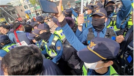 그러나 경찰은 오히려 선전전을 방해한 구사대가 아니라 집회 참가자들을 연행하려 했다. 부당한 공무집행을 막으려 사람들이 연좌하자 경찰이 참가자들에게 물리력을 행사했다. 경찰 기동대는 경찰차와 집회 참가자들 사이의 비좁은 틈을 막무가내로 파고들었다. 연좌한 사람들을 밟을 수 있는 아찔한 상황도 있었다. 결국 경찰은 공무집행 방해라며 연대자의 몸을 누르고 수갑까지 채웠다. 과잉 진압으로 해당 참가자는 왼쪽 손목 찰과상과 등, 옆구리 등 신체 곳곳에 멍이 들었다.