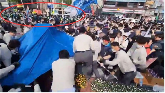 구사대들이 천막 위로 돌진하며 천막을 붙잡고 있던 집회참가자들에게 폭력을 가하는 상황을 경찰은 멀찍이서 지켜보기만 하고 있다. 빨간색 원 안이 경찰이 있는 위치다. (영상 캡처, 출처: 이수기업 해고노동자 안미숙)