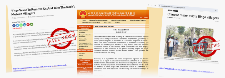 짐바브웨에서는 중국 대사관이 자신들의 가짜뉴스와 진실(“False News and Truth”)’ 웹사이트에 부정적인 기사들을 게시하며 언론을 공격했다중국 국영 언론과 온라인 트롤 네트워크는 기자들을 외국 에이전트돈에 눈먼 자들중국 혐오자로 몰았다.