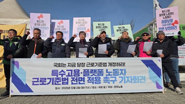 민주노총이 2일 오전 국회에서 기자회견을 열고 특수고용·플랫폼 노동자에게 근로기준법을 전면 적용하는 법 개정을 촉구했다. 민주노총은 “약 400만 명에 달하는 특수고용·플랫폼 노동자가 여전히 법 밖에 방치돼 있다”며 국회가 즉각 논의를 시작해야 한다고 주장했다.