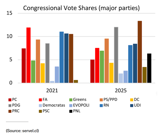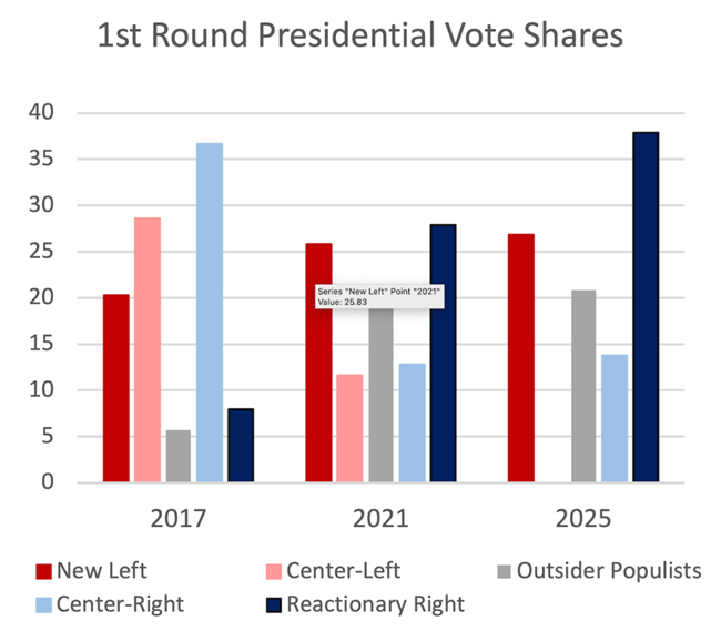 올해 총선에는 다섯 개의 중요한 정당·연합이 경쟁했다. 이 광범위하고 다양한 구도는 칠레의 정당체계가 확실히 독재 이후 지배적이었던 중도 연합에서 벗어났음을 보여준다. 2021년에는 신좌파부터 극우까지 여섯 명의 주요 후보가 경쟁했으며, 그 안에는 중도 연합의 잔존 세력과 두 명의 반체제 아웃사이더도 포함되어 있었다. 그해에는 초보수주의자 카스트가 28%로 1위를 차지했고, 보리치가 26%로 뒤를 이었다. PDG의 ‘상식’ 선동가 프랑코 파리시가 13%를 기록하며 모두를 놀라게 했고, 다른 어떤 후보도 8분의 1을 넘기지 못했다.